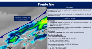 Mérida, Yucatán, 22 de diciembre de 2022.- Ingresa en la tarde noche de este viernes el frente frío No. 19 y, posteriormente, masa de aire frío: Procivy. Se esperan nublados y lluvias de diversa intensidad del 23 al 26 de diciembre. Recomiendan autoridades proteger a niños y adultos mayores de cambios drásticos de …