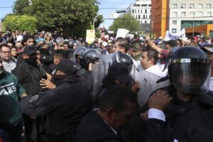 El contingente del gobierno ganó terreno en la explanada, aunque los universitarios se mantuvieron firmes, sin dar un paso atrás, con la consigna hacia los trabajadores estatales “¡Ya se van! ¡Ya se van!” en una avanzada tensa que los mantuvo frente a frente a sólo dos metros de distancia, separadas por reporteros.