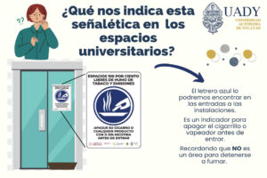 Apuntó que los espacios universitarios cuentan con diferentes señaléticas para la prohibición del consumo de tabaco, entre ellas se encuentran: el letrero azul, el cual se ubica en las entradas de las instalaciones, funcionando como un indicador para apagar el cigarrillo antes de entrar.