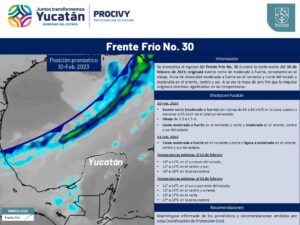 La Coordinación Estatal de Protección Civil (Procivy) informa de la aproximación e influencia del frente frío número 30 a partir de este viernes en el territorio yucateco que originará evento norte con rachas de viento cercanos a los 65 km, oleajes de 2.5 metros de altura, lluvias moderadas a fuertes y temperaturas mínimas cercanas a los 10°C en el suroeste del estado.