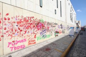 A su paso, mujeres que pertenecían al contingente rayaron la fachada del teatro Daniel Ayala Pérez y el Palacio de la Música, importantes recintos culturales, que también recibió actos vandálicos por parte de las manifestantes.
