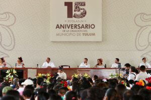 En el marco del 15 aniversario del municipio de Tulum, la gobernadora Mara Lezama Espinosa convocó a todas y todos sus habitantes al trabajo en unidad para la construcción del Tulum del futuro, a sentar las bases para un municipio próspero y pujante por los próximos 50 años, que ya inició con la construcción del Tren Maya y el aeropuerto Felipe Carrillo Puerto.