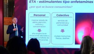 Al referirse a las anfetaminas, explicó que son conocidas coloquialmente como anfetas, elevadores, tachas, speed o MDMA y se comercializan como tabletas, polvos blancos, cápsulas e incluso en forma líquida. Pueden ingerirse, inyectarse, inhalarse o fumarse y generan una sensación euforizante y de súbita energía.