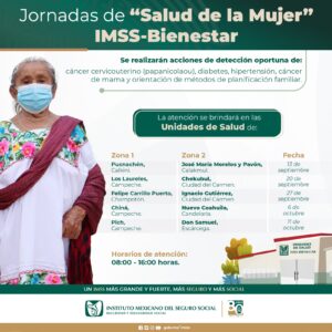 Con el objetivo de llevar los servicios integrales a la población más apartada y aplicar un diagnóstico oportuno, el Instituto Mexicano del Seguro Social (IMSS) en Campeche a través del programa IMSS-Bienestar, convoca a participar a las Jornadas de Salud de la Mujer que visitará los municipios del estado.