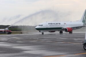 Gracias a las gestiones de la gobernadora, Layda Sansores San Román, siendo su primer vuelo en la capital, la aerolínea de Mexicana de Aviación inicia sus operaciones, con dos frecuencias por semana: martes y jueves, con la aeronave Boeing 737-800.