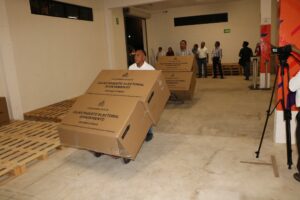 Encabezados por el Consejero Presidente del IEPAC, Moisés Bates Aguilar, la Consejera Alejandra Pacheco Puente, los Consejeros Alberto Rivas Mendoza y Roberto Ruz Sahrur, el Secretario Ejecutivo, Enrique de Jesús Uc Ibarra y el Director Ejecutivo de Organización Electoral y de Participación Ciudadana, Danny Israel Och Góngora, supervisaron la descarga del material en la bodega electoral ubicada en el tablaje catastral 16734; en la calle 42 por 29 B y 29 de la colonia San Juan Bautista, en el periférico poniente de la ciudad.