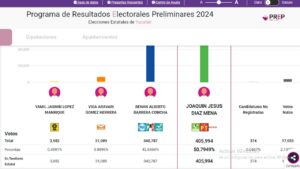De acuerdo con el corte de las 8 A.M de este día, el Programa de Resultados Preliminares Joaquín Díaz está arriba en la competencia electiva, con 405 mil 994 votos, contra 340 mil 783 de Renán Barrera Concha, del PAN, PRI y PANAL, diferencia de 65 mil 207 votos.