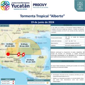 La Tormenta Tropical “Alberto” se encuentra afectando a Veracruz y Tamaulipas, ya muy lejos de Yucatán, por lo que no representa riesgo directo. Sin embargo, continuarán las lluvias para este fin de semana por una nueva baja presión localizada frente a la bahía de Campeche, informa Protección Civil de Yucatán (Procivy).