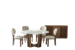 Uno de los materiales más destacados de esta temporada es el vidrio en diferentes aplicaciones y acabados, desde innovadores vidrios martillados y vidrios pigmentados, hasta el inesperado retorno del vidrio natural como elemento protagónico en los muebles.
