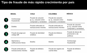 En México, el tipo de fraude de más rápido crecimiento son las estafas, seguidas por el fraude de colusión (colusión entre comprador y vendedor, por ejemplo), el fraude de abuso de promoción o de políticas, el contracargo fraudulento, seguido por el fraude de cartera digital.