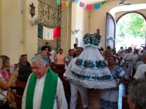 En la puerta de la iglesia el párroco Lorenzo Mex recibió al gremio y bendijo las ofrendas y dio paso a los coloridos estandartes que cuentan la historia de La Esperanza Católica de San Sebastián.