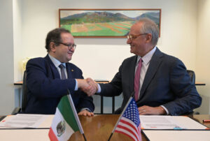 La firma del convenio se realizó en el edificio principal de la UTSA, donde el presidente Eighmy también felicitó al rector Leonardo Lomelí y a la directora de la UNAM San Antonio, Paula de Gortari, por los 80 años del establecimiento de esta escuela de extensión en la ciudad texana.