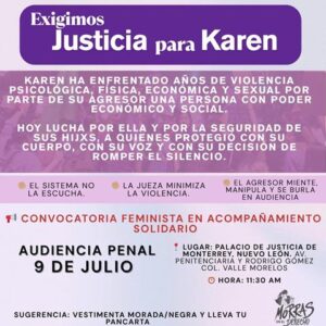 En fechas anteriores Karen pidió que se escuchara a su hija, como lo establece el derecho del menor a ser oído. Sin embargo, en audiencia preliminar familiar de fecha 3 de julio, la fiscal del juzgado familiar acusó a Karen de manipular a la menor, sin ofrecer prueba alguna, revictimizándola. La jueza no detuvo esos señalamientos ni protegió a la víctima. Para esa fiscal, permitir que una niña exprese su opinión es sinónimo de manipulación, lo cual viola gravemente los derechos de la infancia. La Fiscal intimidó a Karen para que en frente de su agresor relatara todos los hechos de violación y violencia que vivieron sus hijos y en consecuencia ella; Karen no recibió apoyo psicológico, fue revictimizada por la fiscal y la jueza y no se respetó su dignidad.