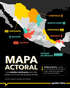 De acuerdo con un análisis realizado por la plataforma Spoiler, la Ciudad de México lidera con al menos 12 actores reconocidos en la Meca del Cine. Figuras como Diego Luna, Eiza González, Demián Bichir, Eugenio Derbez, Marina de Tavira o Tenoch Huerta nacieron en la capital y, en su mayoría, estudiaron en escuelas como el CUEC, el CCC, el INBA o el CEA.