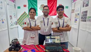 Valentín Contreras Hernández y José Ángel Reyes Guzmán, acompañados del docente Ángel Vergara Betancourt, presentaron en la exposición mundial el desarrollo de Fitobot, un robot autónomo para Monitoreo Fitosanitario en entornos confinados.