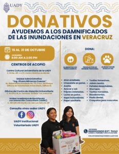 Como muestra de solidaridad y compromiso social, la Universidad Autónoma de Yucatán (UADY), a través de su Voluntariado Universitario, habilitó diversos Centros de Acopio, con el objetivo de reunir ayuda humanitaria destinada a las familias afectadas por las recientes inundaciones en el estado de Veracruz.
