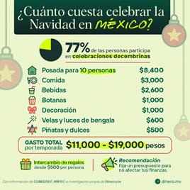 Por otro lado, la Comisión Nacional para la Protección y Defensa de los Usuarios de Servicios Financieros (CONDUSEF), menciona que los mexicanos gastan en promedio de 11 mil a 19 mil pesos durante estas celebraciones (considerando regalos) y la cena de Navidad representa uno de los gastos más grandes que se realizan durante la época decembrina.